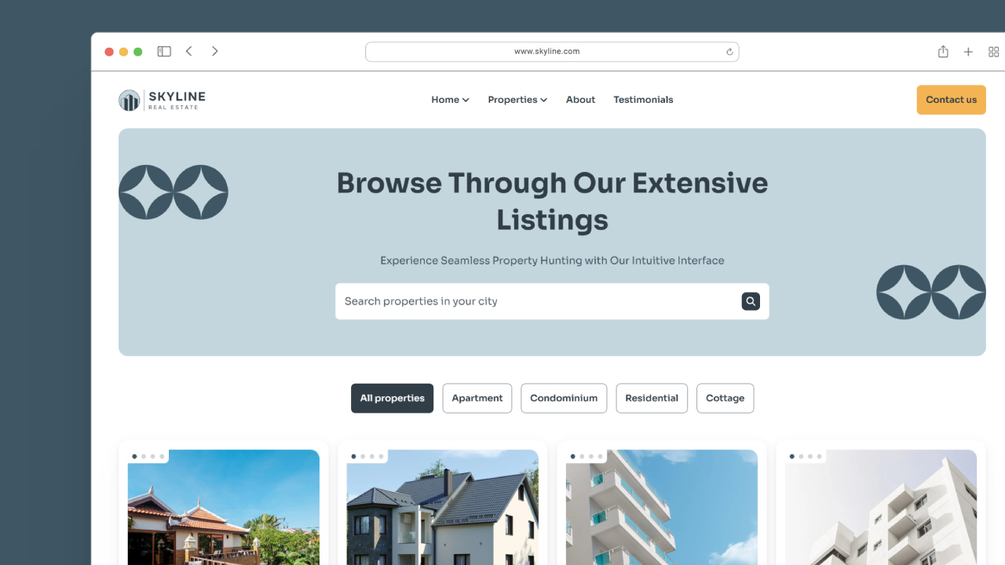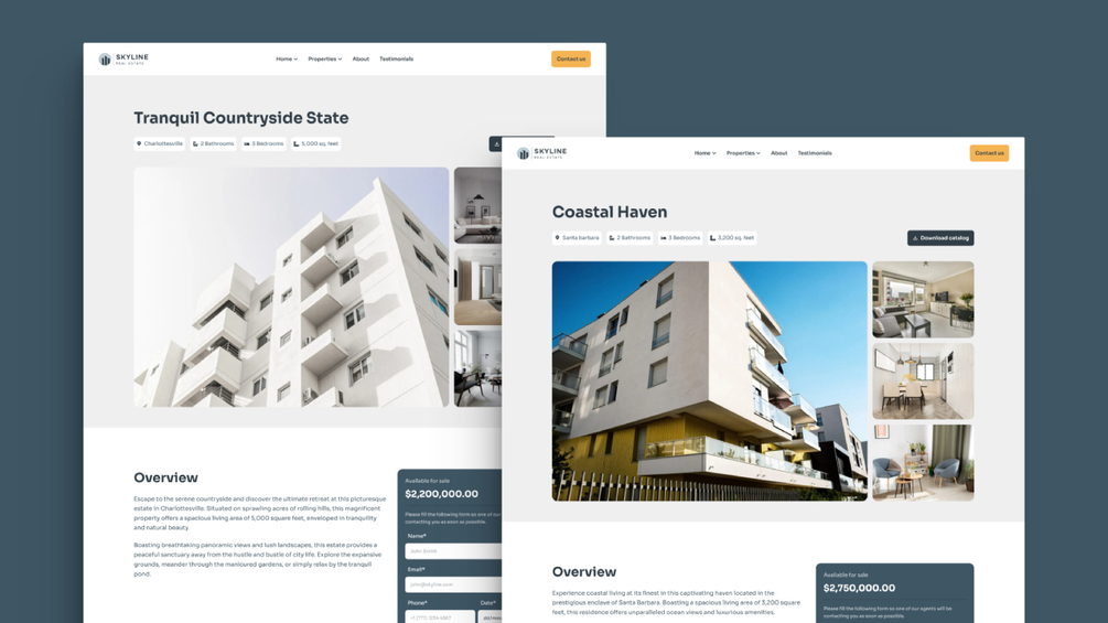Introducing Skyline – the solution you were waiting for to create a professional and user-friendly real estate website for your agency. It is designed to showcase properties, provide essential information, and engage potential buyers. This template features a dedicated page to display property listings.